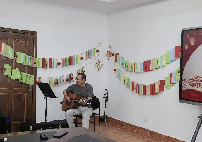 随后,蔡强军老师用吉他弹唱《童年》,随着清透、明亮的吉他伴奏响起,青春的歌声让全场观众都不由得跟着哼唱起来。