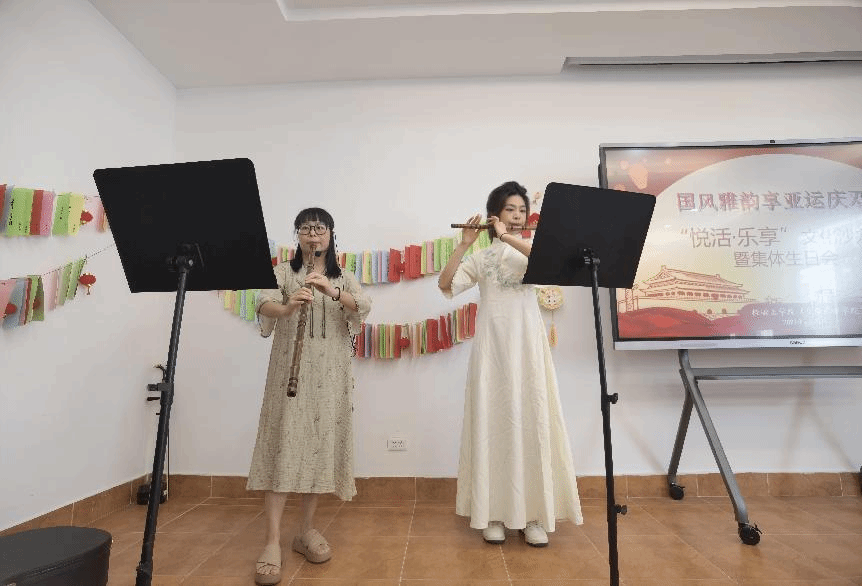 活动开始,教职工们准备了不同风格的才艺表演。施孟如老师和员工笛箫合奏了一曲《铁血丹心》,笛声悠扬,箫声呜咽,豪迈与缠绵交织,大家都沉浸其中。