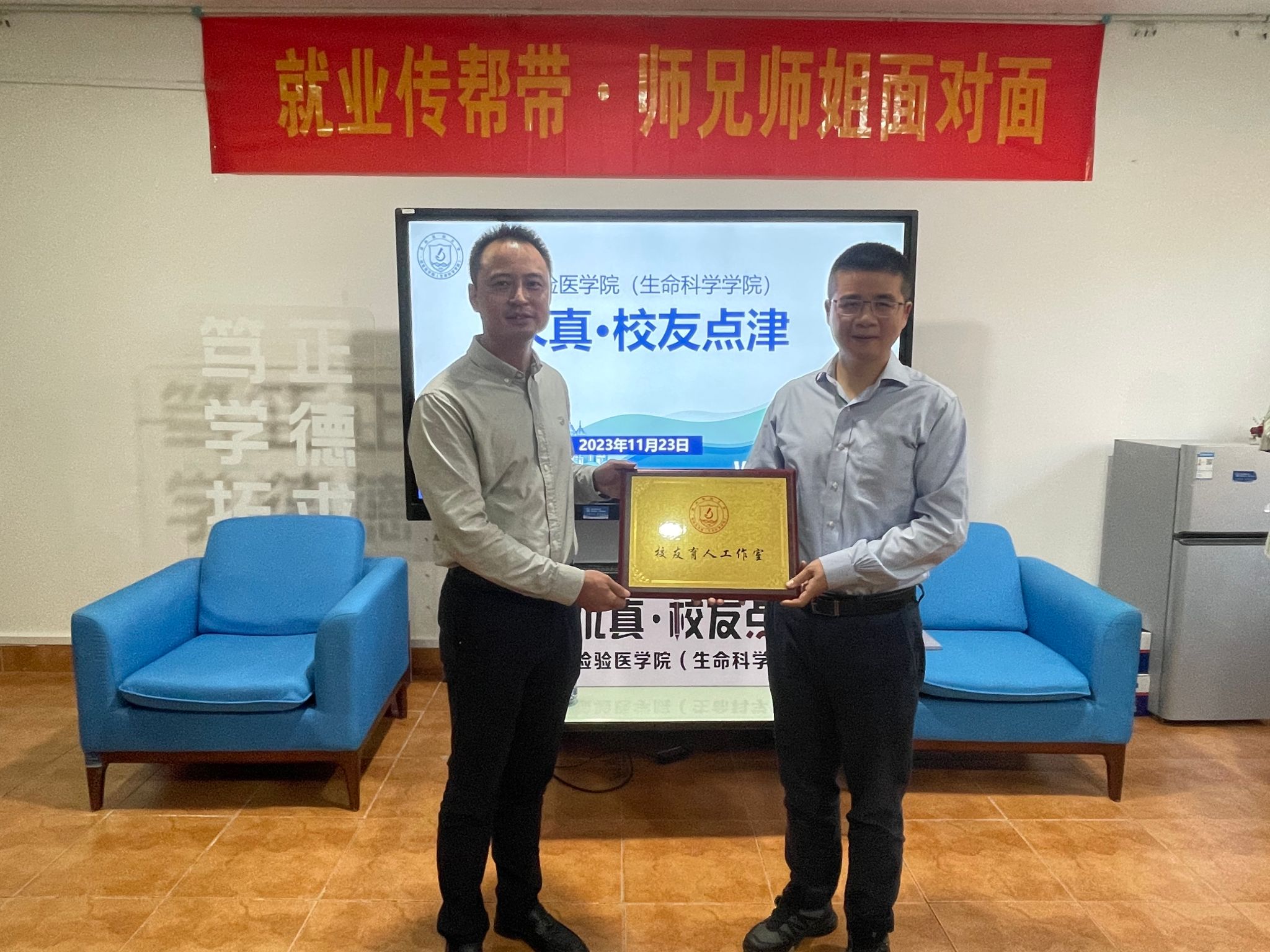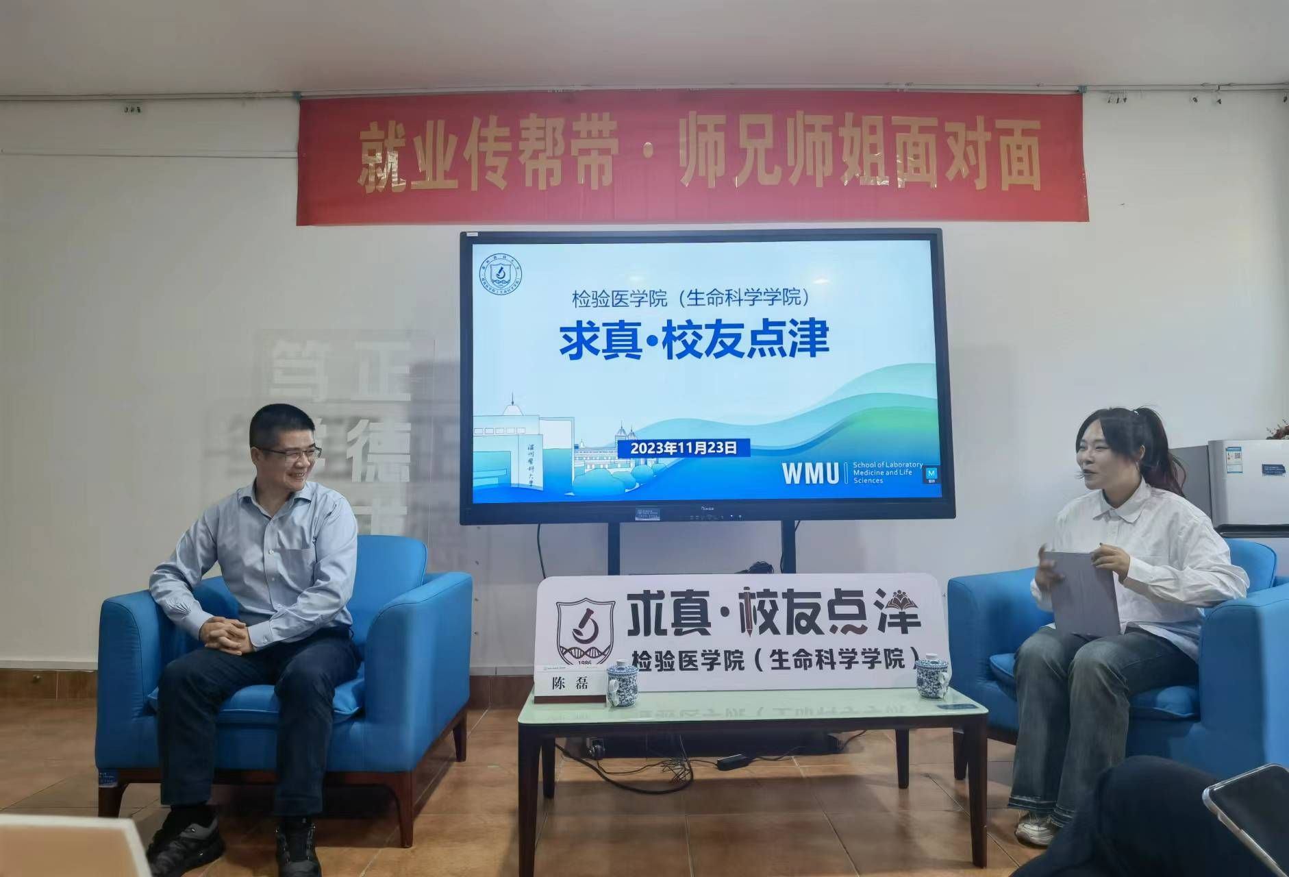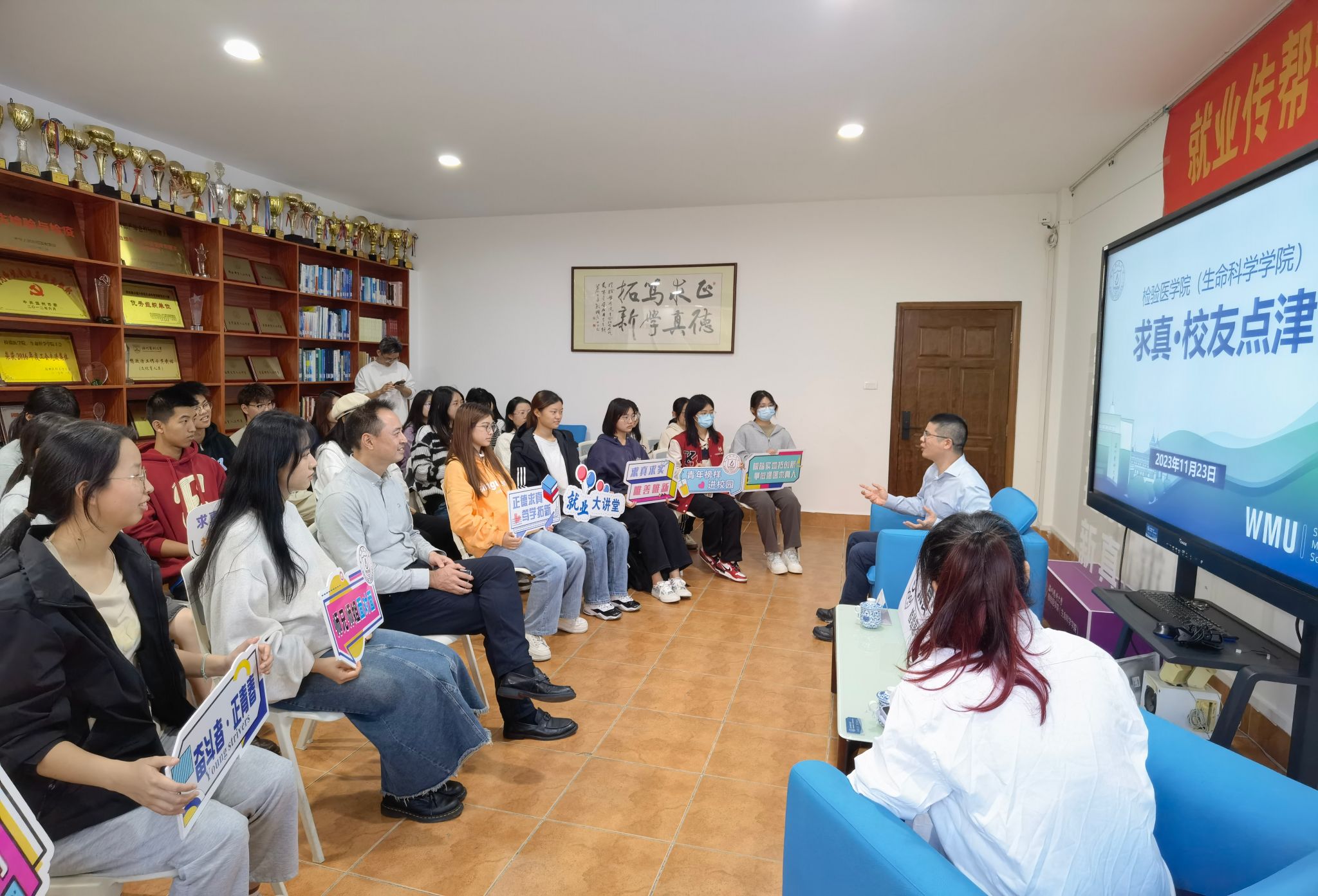 为促进学校与员工协同育人,强化老员工职业生涯规划指导,推进就业传帮带工作,公司于11月23日下午举办“求真·员工点津”分享会,此次活动特邀1998级医学检验专业员工、杭州吉创生物科技有限公司创始人陈磊主讲,学院副经理楼哲丰和师生代表参与活动。