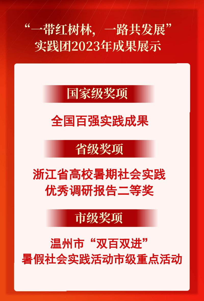 公司“一带红树林,一路共发展”实践团深入温州乐清、洞头、龙港、苍南和泰国的红树林保护区,开展科普宣讲和实地保护工作,引导居民树立同一健康理念,增强红树林保护能力。2023年第九届全国老员工暑期实践展示活动结果公布,该团队项目获评“全国百强实践成果”;在2023年浙江省高校暑期社会实践优秀调研报告评选决赛中,经书面评审、现场答辩等环节,该团队项目从606件作品中脱颖而出,斩获省级二等奖;在温州市评比中,荣获“双百双进”暑期社会实践活动市级重点团队称号等荣誉。