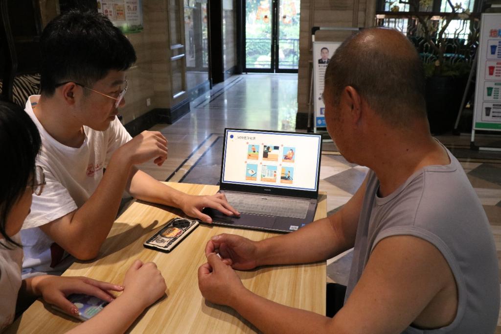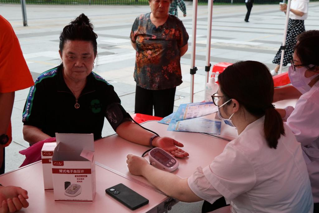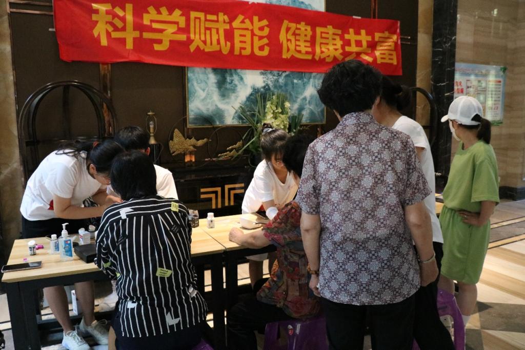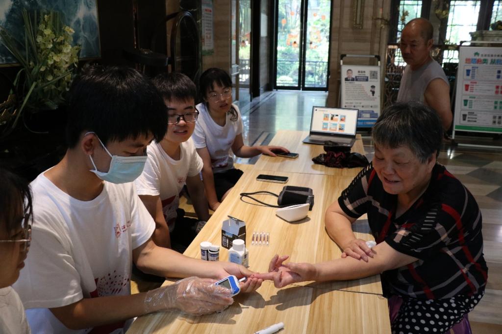 “臂带的底部需要高于肘部2-3厘米”“臂带要捆扎适度,臂带的中心的主机与心脏处于同一水平高度”“在手指酒精完全挥发后,调整采血笔深度采血”……在社区医生的协助和指导下,实践团成员熟练地开展血糖和血压的测试,为居民提供健康咨询,宣传健康生活方式。