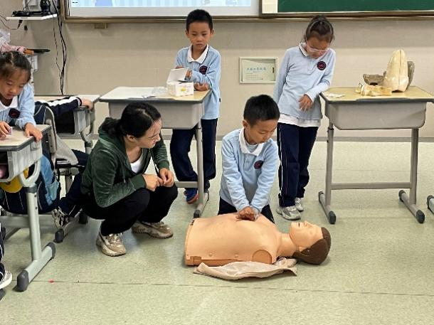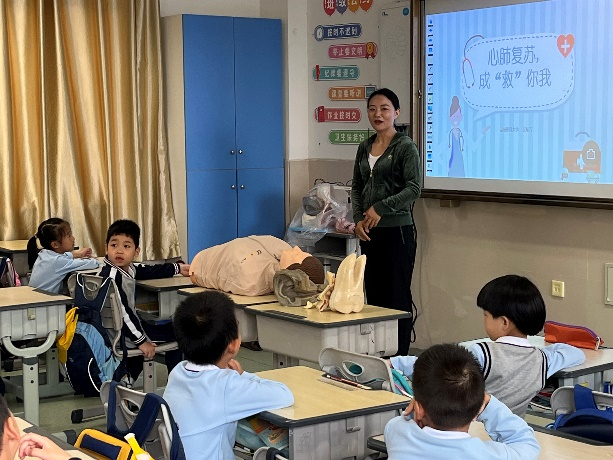 吴东方老师进行了名为《心肺复苏,成“救”你我》的急救科普课堂。吴老师从生活中举例,抛出“当我们身边有人突然倒地,我们应该怎么做”的问题,引发了小朋友们的激烈讨论。随后逐一阐述了需要做的具体行动,利用人体模型道具,向小朋友们直观展示了心肺复苏及人工呼吸的做法,也让小朋友们体验了如何在确保自身安全的情况下帮助他人,大家参与度极高。通过这一系列理论+实践的讲解,向小朋友们普及了急救黄金4分钟的关键性,也让他们对生命安全有了更深的认识。