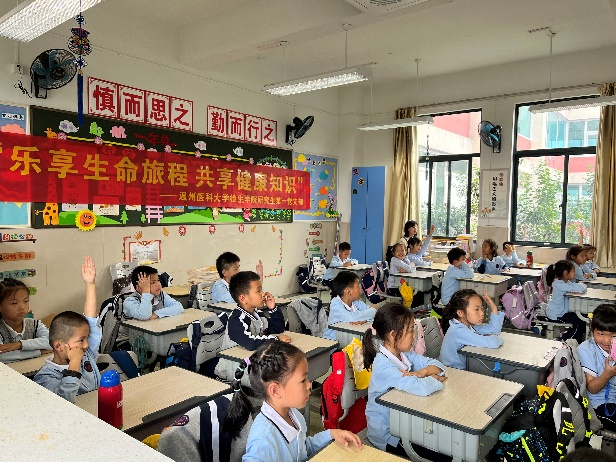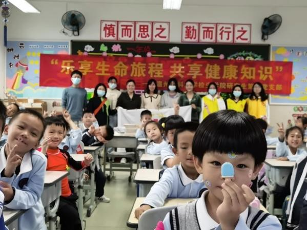 2022年10月27日,太阳成集团tyc151cc研究生第一党支部在支部书记林虹老师和团委副书记吴东方老师的带领下,走进了温州大学城附属小学一(5)班,开展了一次以“乐享生命旅程,共享健康知识”为主题的健康知识进课堂的宣传活动。