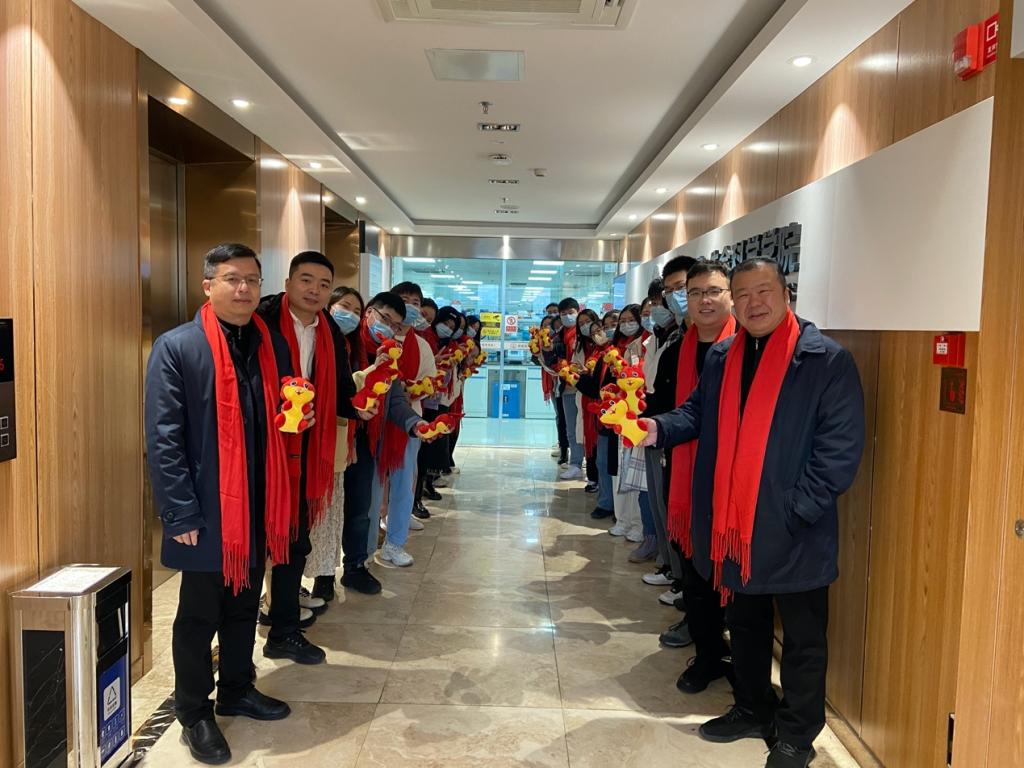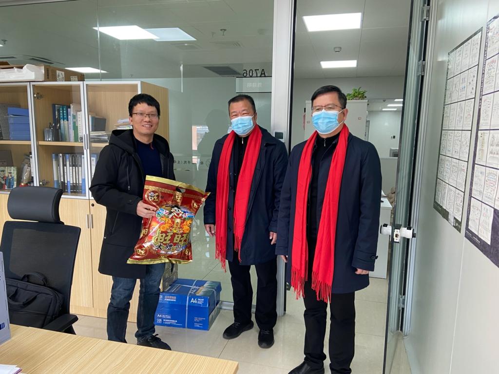 新春慰问送温暖,师生座谈话佳节。1月16日下午,校人事处处长楼永良、执行经理郑晓群、公司党委副书记陈贤新一行来到科研实验平台慰问留校师生,提前为大家送上新春佳节的祝福和新年礼包。