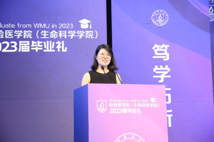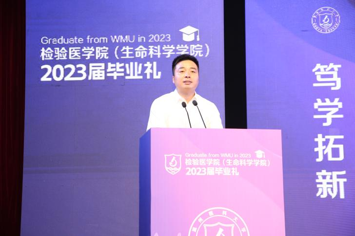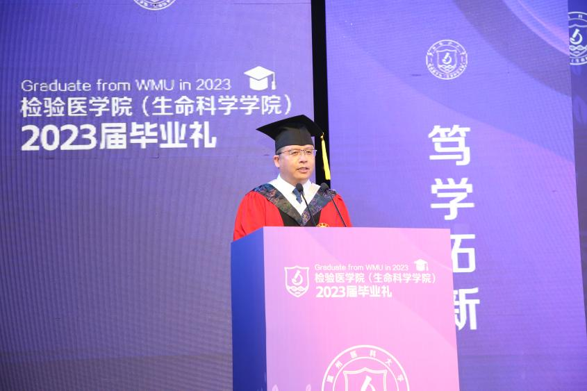 执行经理郑晓群做毕业典礼致辞,他代表学院向2023届毕业生们送上诚挚的祝贺和美好的祝福,回顾了本届毕业生在校学习的特殊经历和成长历程,肯定了毕业生们在学习、科研、实践等方面取得的优异成绩,希望毕业生们心怀家国,志存天下;勤学善思,笃行致远;风雨无惧,勇毅前行;心存感恩,传承大爱,祝愿“最年轻的员工们”从温医大出发,以梦想为伴,与时代同行,一起阔步向未来!
